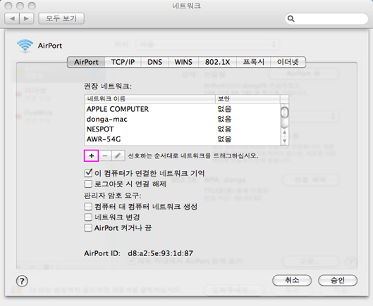 3. <그림3>과 같이 AirPort 탭에서 “+” 버튼을 클릭합니다. <그림 3> 네트워크 설정 화면 |