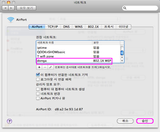 5. <그림5>와 같이 추가한 donga 네트워크를 확인 한 후, [승인]을 클릭합니다. <그림 5> 네트워크 설정화면 |